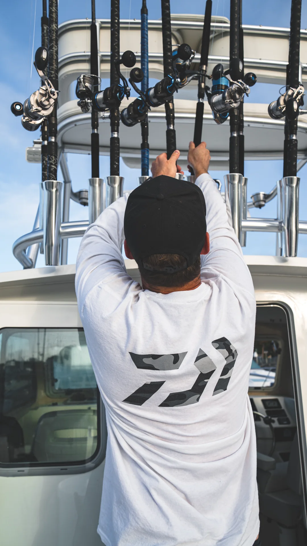 White long sleeve T-shirts made from high quality 100% Cotton with stylish Gray Camo D-VEC pattern logo on the back with a Black D-VEC logo on the front.